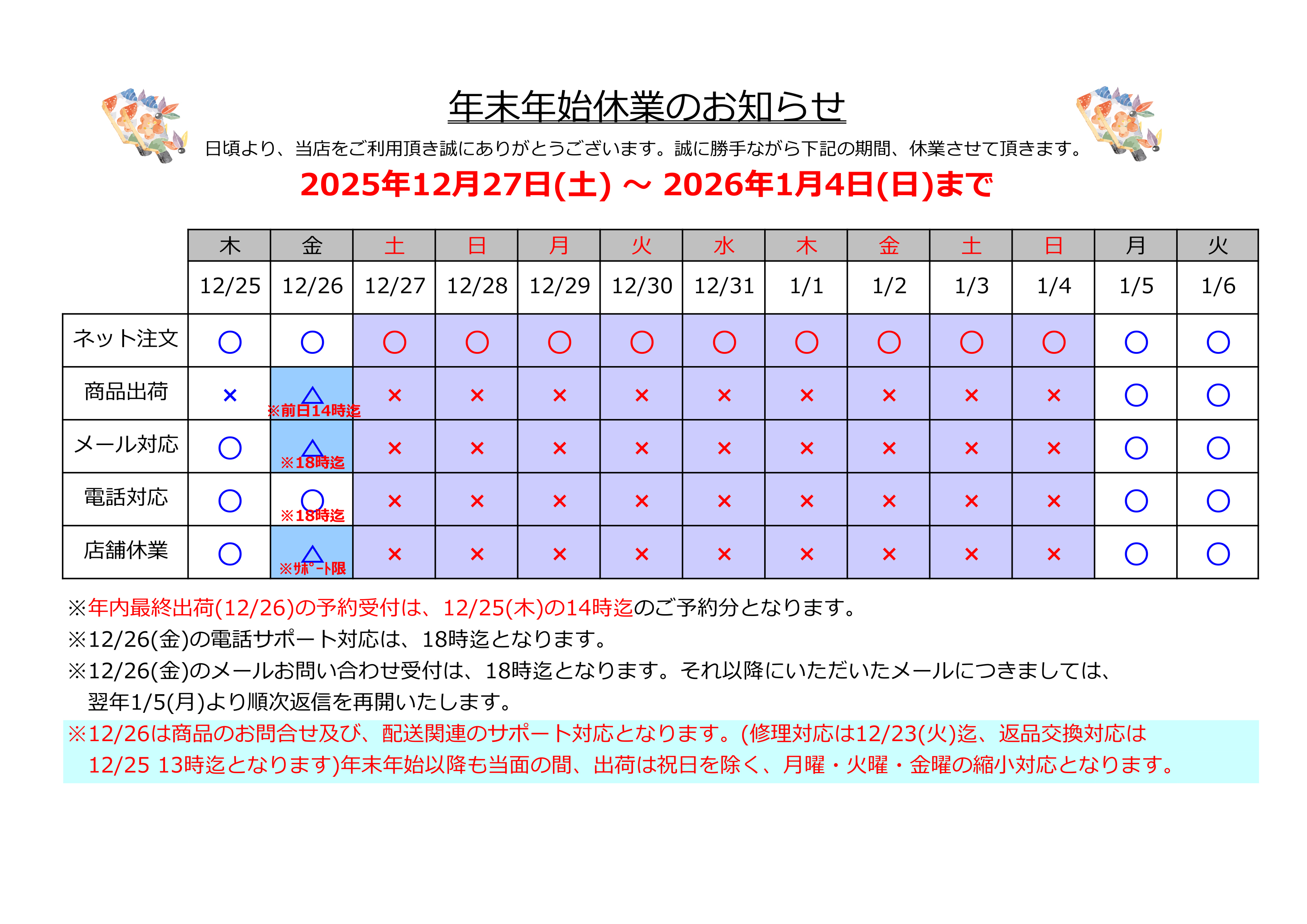 - 年末年始休業期間のご予約・発送・お問い合わせについて