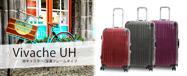 本商品「Vivache UH」は、ダブルキャスターを搭載した足回りの良さ、深溝フレームを採用したことによる頑丈さを強化した商品です。表面は飽きの来ないシンプルかつ洗練された鏡面ボディデザイン、ワンポイントのシルバーのハンドルバーがチャーミングなスーツケースです。